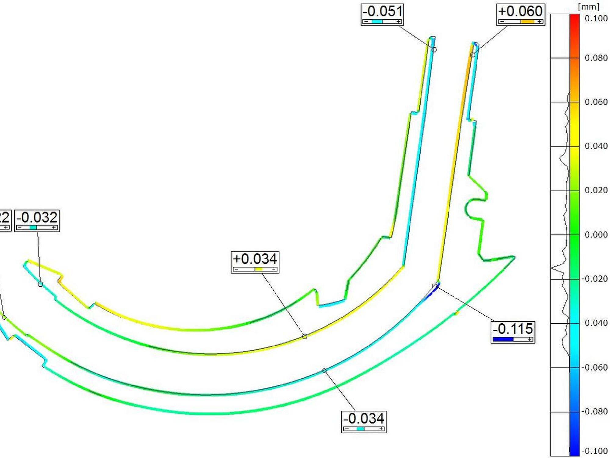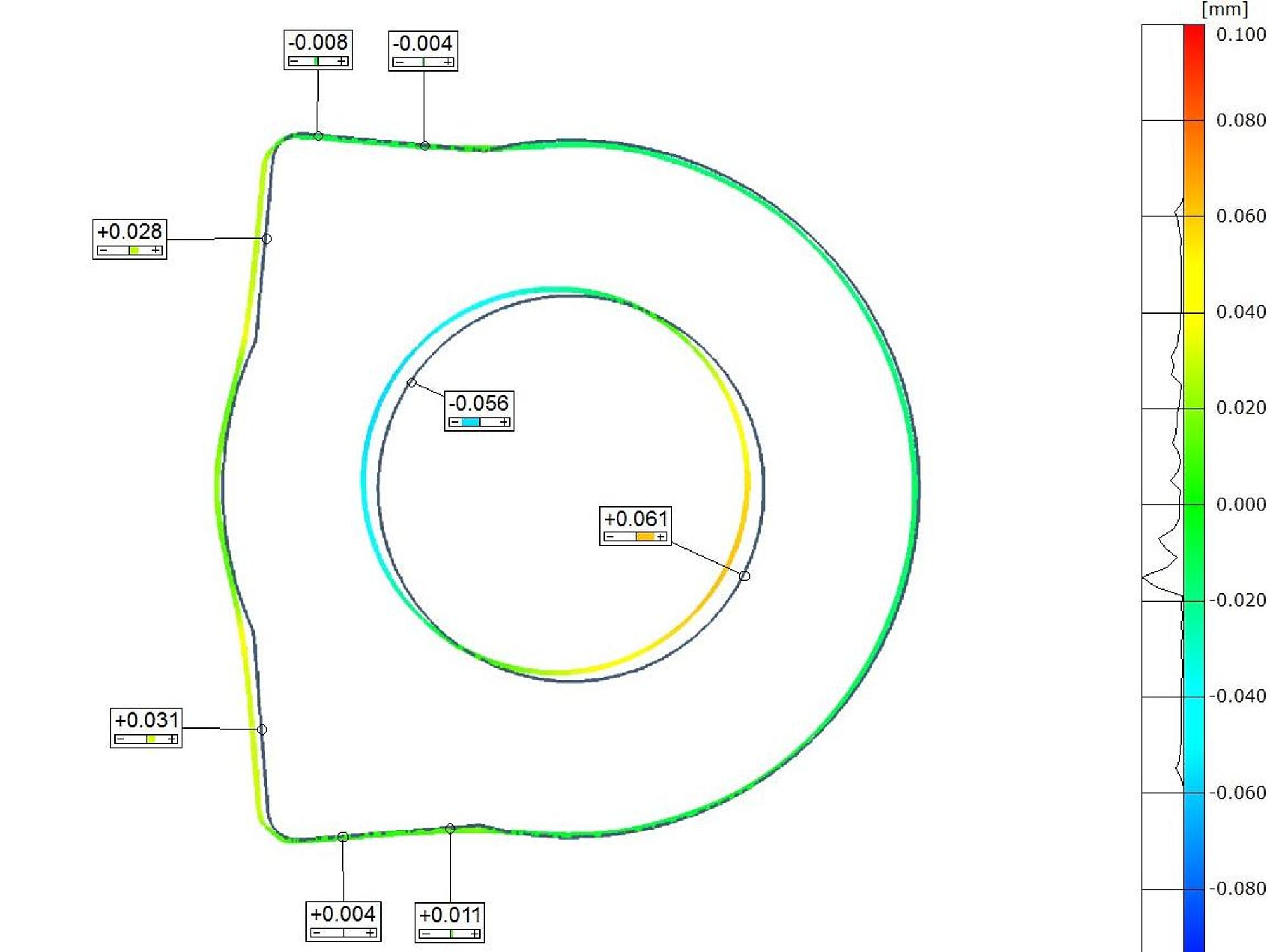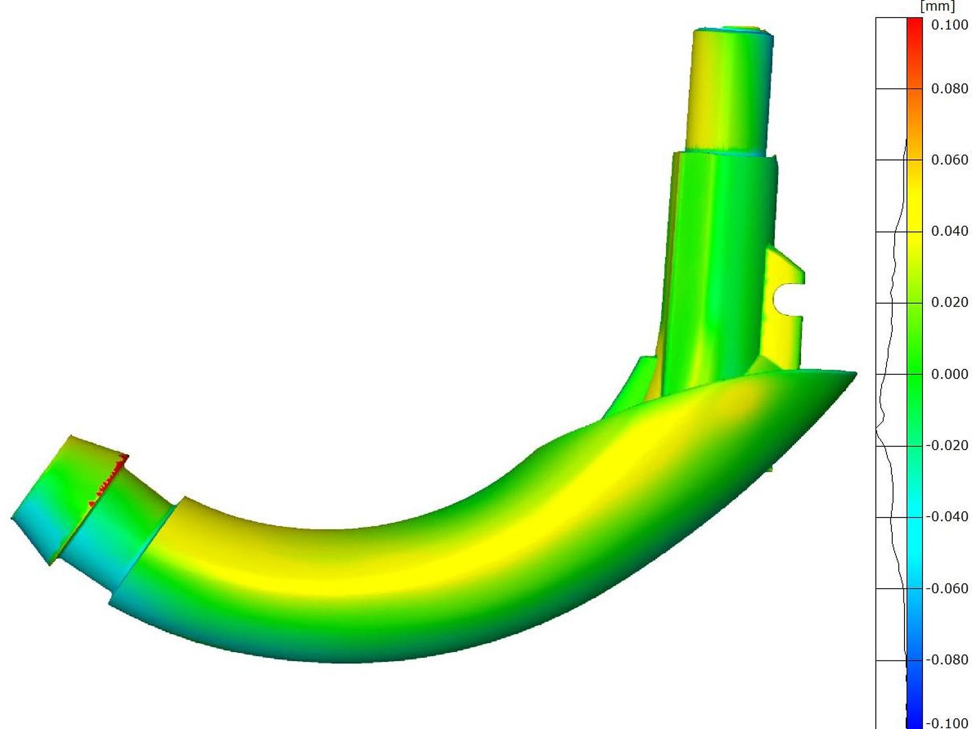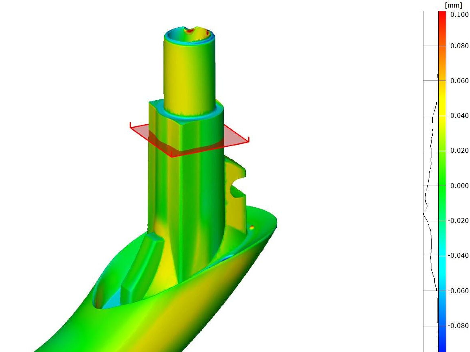 Resultatet af sammenligning mellem CT scan og CAD var et farveplot, der viste blandt andet forskydning af det indvendige rør og samt en mindre indvendig støbefejl.