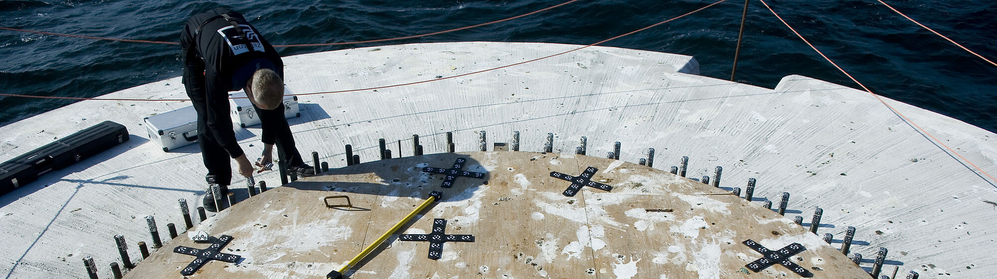 Zebicon har opmålt afstanden mellem betonplatformenes bolte, for at sikre at tårnene passer præcist på platformene. Til opgaven blev brugt det mobile og fleksible 3D koordinatmålingssystem TRITOP CMM.