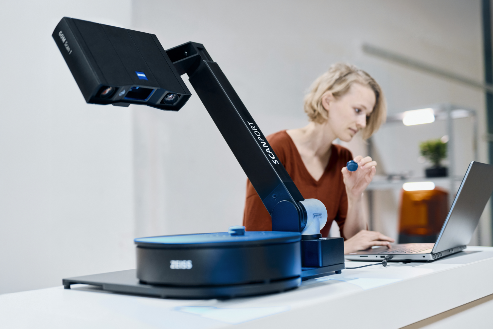 Med ZEISS ScanPort automatiseres scanningsforløbet, så du undgår manuel indgriben under selve scanningen. Den integrerede robotarm kan hæves, sænkes og vippes i flere retninger, og når den anvendes sammen med rotationsbordet, opnås en komplet og effektiv dækning af emnet fra flere vinkler og afstande.